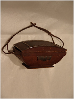 Neceser del siglo XVIII, hecho en cartoncillo endurecido y forrado con fina pie. Cordón de piel para portar(Museo del Bolso)